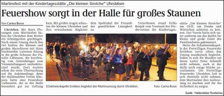 Auch Wind und Regen konnten die Kinder, Eltern, Großeltern und viele Andere nicht davon abhalten das Martinsfest zu feiern. Familie Lühmann hatte auf Grund der schlechten Witterung kurzfristig eine Getreidehalle als Veranstaltungsort zur Verfügung gestellt. Diese war groß genug, dass sogar die Feuershow vom Verein Khepera aus Haldensleben dort stattfinden konnte. Der Förderverein hat fleißig Würstchen und Steaks gegrillt die auch zahlreiche Abnehmer fanden. Für die Kinder hat Bauer Lühmann extra einen Traktor bereit gestellt, der auch rege von den Kindern zum Spielen in Anspruch genommen wurde. Die Veranstaltung war für alle ein voller Erfolg!