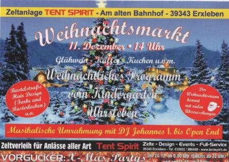 Am Sonnabend, den 11.12.2010 ab 14:00 Uhr findet in der Zeltanlage TENT SPIRIT, Am alten Bahnhof (zwischen Uhrsleben und Erxleben) ein kleiner Weihnachtsmarkt statt.
